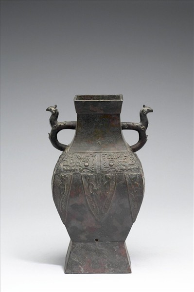 方壺,盤口,短頸,雙環耳,斜肩,圓腹,高圈足,耳做獸首形,獸首向上高凸。器肩至腹部飾獸面紋飾帶與蕉葉紋。
