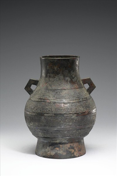 圓壺,盤口,長頸,雙耳,斜肩,圓腹,圈足,耳為橋形耳。器腹飾紋雷紋飾帶四道。器內有銘文