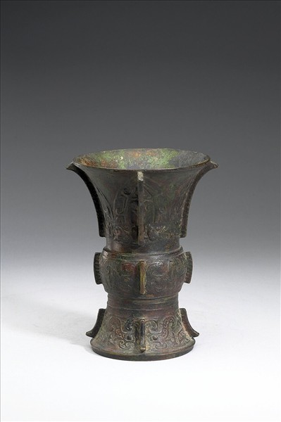 三段式尊,敞口,圓腹,圈足,有棱脊。脰部為小鳥紋飾帶與向上延伸的蕉葉紋,腹與圈足處則飾獸面紋。