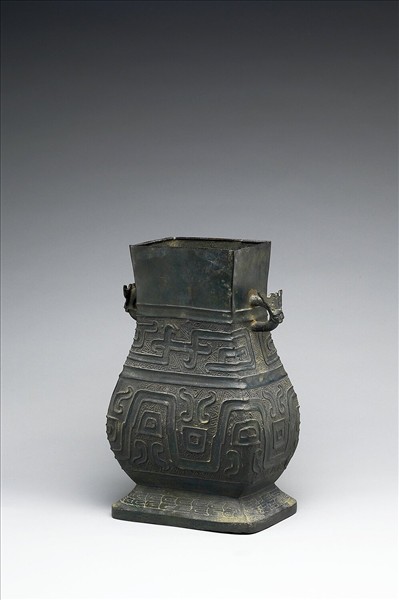 扁壼,侈口,直頸,獸耳,圈足,腹剖面呈略方形,範線明顯,足有傷缺。腹上層飾幾何紋,下層飾波帶紋,足飾重環紋。