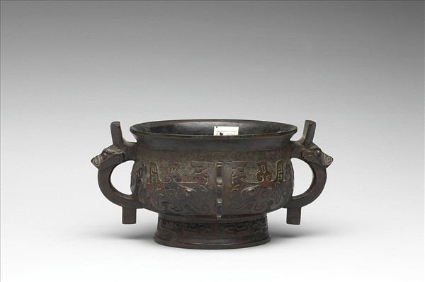圓簋,侈口,雙耳,圓腹,圈足,耳作獸首形附珥,腹有棱脊。頸飾雷紋,腹飾獸面紋,足飾夔紋,腹、足均以雷紋為地。器內似有銘。