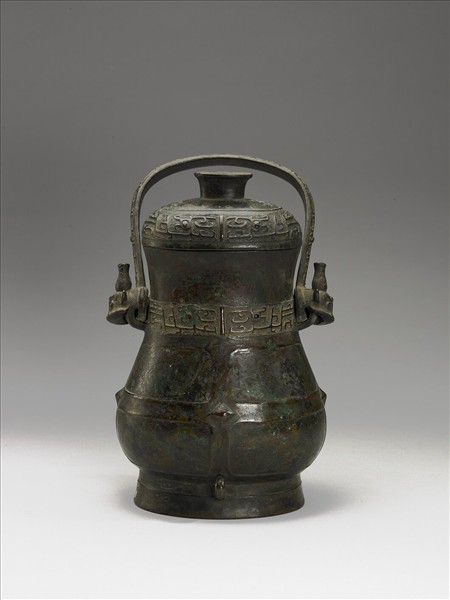 卣,附鈕蓋,圈足鈕,侈口,直頸,板形提樑,垂腹,圈足,兩端為獸首。全器做橢圓形。提樑飾蟬紋,蓋面與肩部飾夔紋,以雷紋為地,器腹為十字形紋,接近圈足處另飾一單環耳。