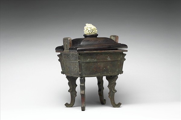 方鼎,立耳,平底,扁足,腹有棱脊,附木蓋白玉。腹飾鳥紋、獸面紋,以雷紋為地,足飾夔紋。