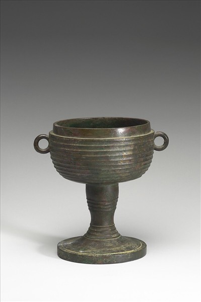 豆,子母口,環耳,高圈足。腹、足飾瓦紋。