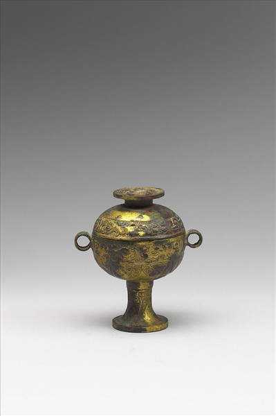 豆,蓋腹合呈圓球體,蓋附抓手,子母口,圈足,器兩側有成組環耳。全器鎏金,蓋飾夔紋,腹飾夔紋、蕉葉紋,足飾蕉葉紋,均以雷紋為地,抓手亦飾有幾何紋。