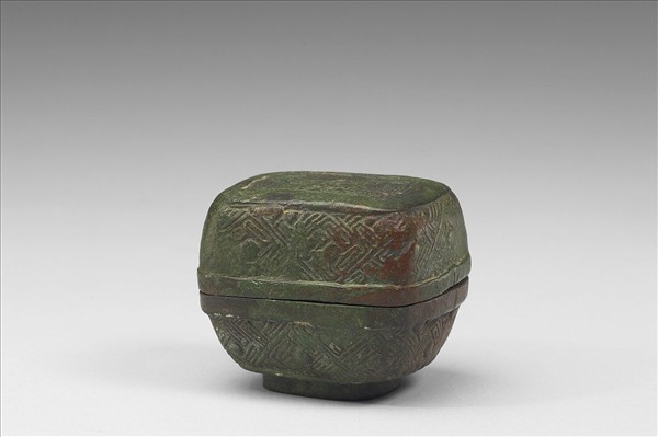 方盒附蓋,平頂蓋,子母口,圈足。蓋與器面飾幾何紋飾。