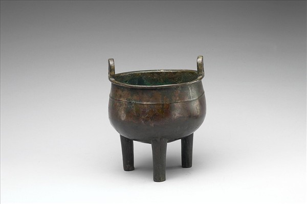 圓鼎,盤口,立耳,三柱足。腹飾弦紋。