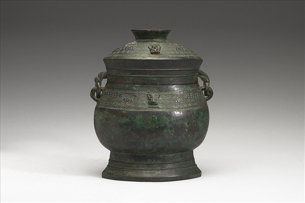 圓卣,附抓手蓋,子母口,縮頸,鼓腹,圈足,蓋、腹均有小獸首,頸側出雙耳,耳內穿提粱,提粱以綯紋為形。蓋、頸上下均有連珠紋,內飾獸面紋。足飾弦紋。蓋、器內有銘二字。
