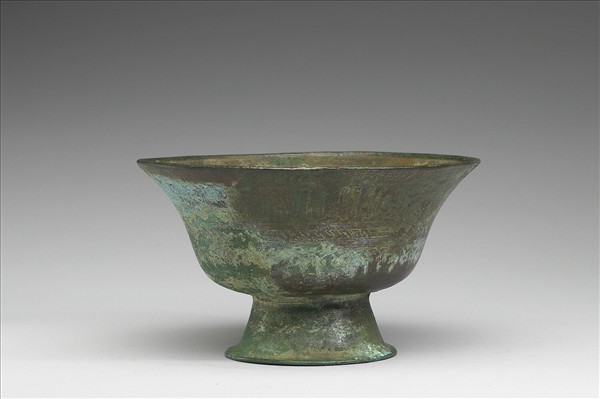圓簋,侈口,弧形壁,圈足。腹有紋飾三圈,無法辨識。器另內有圓形紋飾。