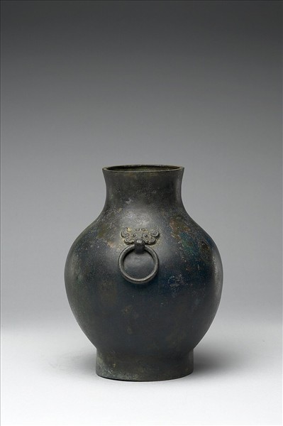 圓壺,直口,短頸,斜肩,圓腹,圈足,器頸兩側有鋪首銜環。