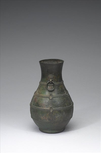 圓壺,直口,短頸,斜肩,圓腹,圈足,器頸兩側有鋪首銜環。器腹飾圜絡紋。