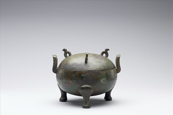 鼎,附鈕蓋,蓋上有三環鈕,子母口,立耳,圓腹,蹄足。