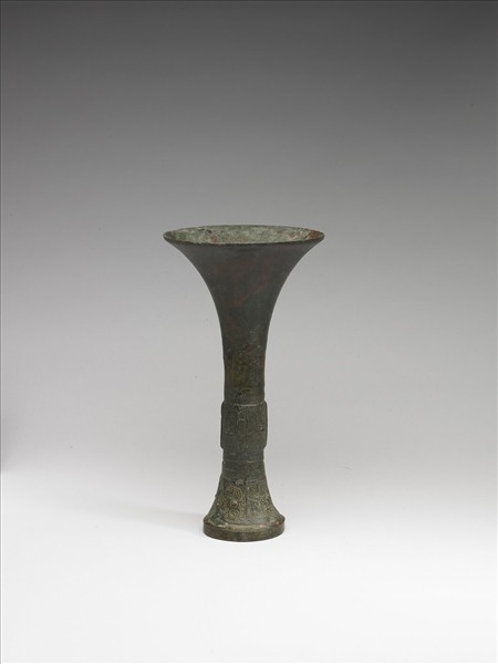 觚,侈口,鼓腹,圈足。脰、腹交接處飾弦紋,腹飾獸面紋,腹、足交接處飾弦紋,足飾獸面紋、雲雷紋為地,足部紋飾幾為銅鏽所掩。