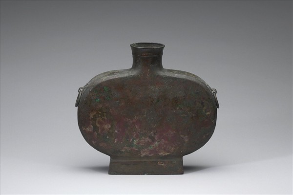 扁壺,盤口,短頸,斜肩,扁腹,方圈足,器肩兩側有鋪首銜環。