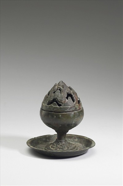 博山爐,子母式口,圓腹,短柄,柄下承一淺盤。蓋飾鏤空山形紋,足飾出水紋。