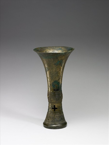 觚,盛酒器,喇叭口,長頸,微鼓腹,圈足。腹部與足有獸面紋及圈紋,紋飾中間有三道細線淺浮雕弦紋及兩個十字形足孔。