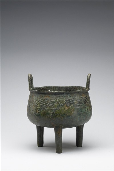 圓鼎,立耳,腹略垂,柱足。腹外飾夔紋。