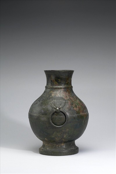 圓壺,鼓腹,圈足,肩上二獸面銜環。頸、腹飾弦紋。