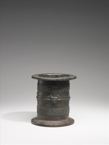 車器,器呈筒狀,兩端作寬緣。器外壁飾三嵌金銀獸首、蟠虺紋。口沿有銘「子孫永寶」四字。