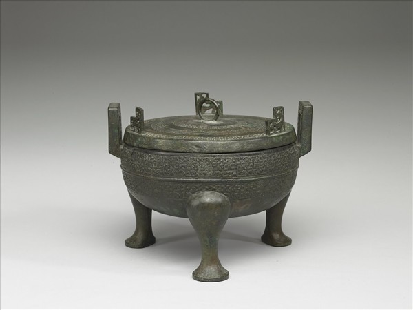 平頂蓋,蓋面正中為一環耳鈕,蓋沿環繞著三個矩形鈕。器身為子母口,附耳,圓腹,蹄足。蓋飾蟠虺紋二道,三角形雲紋及繩紋一道。器腹正中飾繩紋一道,上下遍飾蟠虺紋,兩附耳內外飾綯紋,三款足。著錄於《西清續鑑‧乙編》卷三頁三十六「漢蟠虺鼎二」。