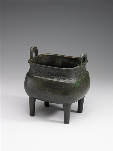 方鼎,立耳,盤口,束頸,鼓腹,四柱足。頸飾夔紋。