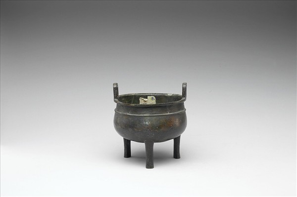 圓鼎,盤口,立耳,三柱足。腹飾弦紋。
