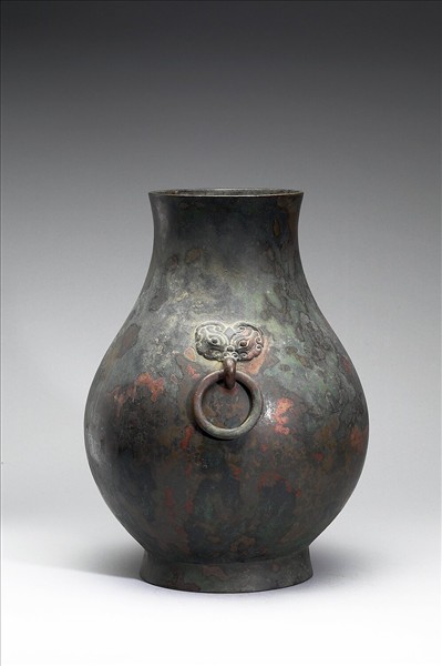 圓壺,直口,短頸,斜肩,圓腹,圈足,器頸兩側有鋪首銜環。