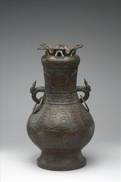 圓壺,附蓋,蓋為冠狀頂,直口,長頸,斜肩,兩環耳,鼓腹,階狀圈足,耳做獸首形,帶環。蓋沿處與肩部飾簡化夔龍紋,頸部與腹部則為波帶紋,圈足飾垂鱗紋。器蓋與器內壁有銘文。
