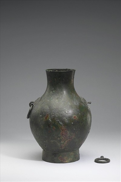 圓壺,直口、長頸、斜肩、圓腹、圈足,器頸兩側有鋪首銜環,一環脫落。