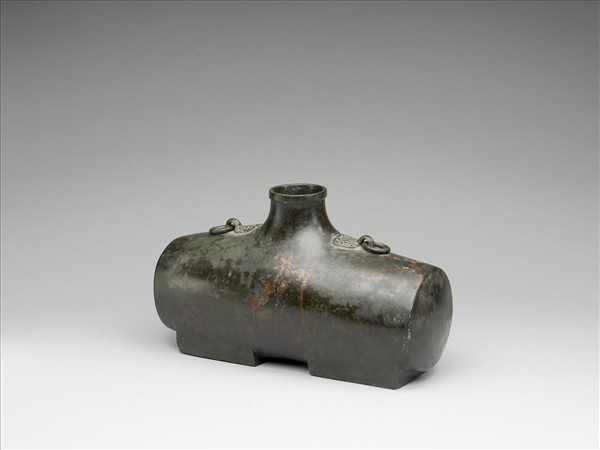 榼,子母蓋,蓋附環鈕,器腹為橫圓筒形,腹上兩側有環耳,下有方足。
