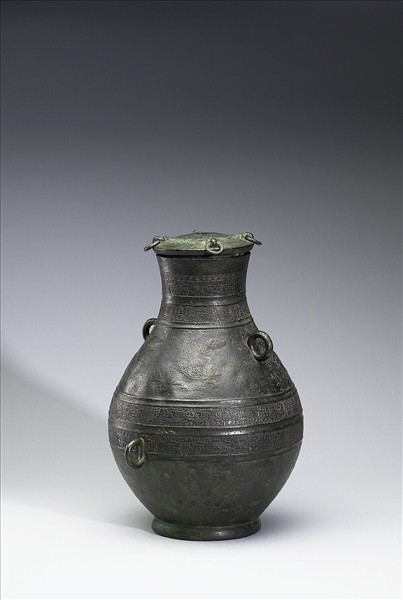 帶蓋圓壺,鼓腹,圈足,肩上二環耳,腹一環耳,子母口式蓋,蓋上四半環鈕加環。頸飾綯紋、蟠螭紋,肩飾獸紋,腹飾蟠夔紋。