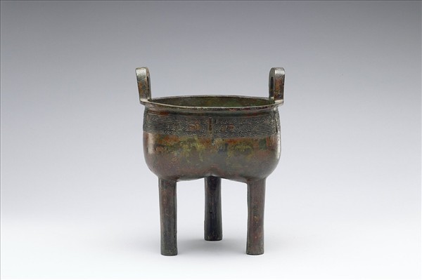 鬲鼎,折沿,立耳,分襠底,柱足。口沿飾下獸面紋飾帶。