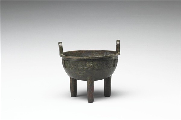 圓鼎,盤口,立耳,深腹,柱足。腹飾雷紋三圈,中央飾獸首、棱脊,與三足位置相對應。