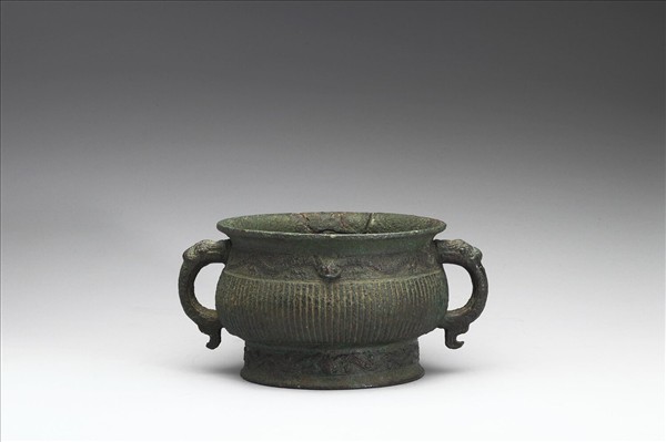 圓簋,侈口,雙耳,縮頸,圓腹,圈足,耳作獸首形附珥。口沿殘,耳、腹、圈足有銅器病。頸、足飾一首雙身龍紋,腹飾直棱紋。器底有銘。