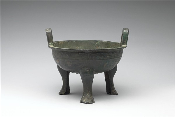 圓鼎,盤口,立耳,蹄足。腹飾有目竊曲紋,下有一凸棱。
