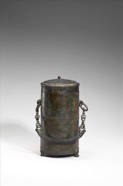 帶蓋樽,圓筒形器身,子母式口,深直壁,平底,三獸足,環鈕,腹作二環耳,二耳繫以鍊,中連提梁。器外壁飾帶紋。