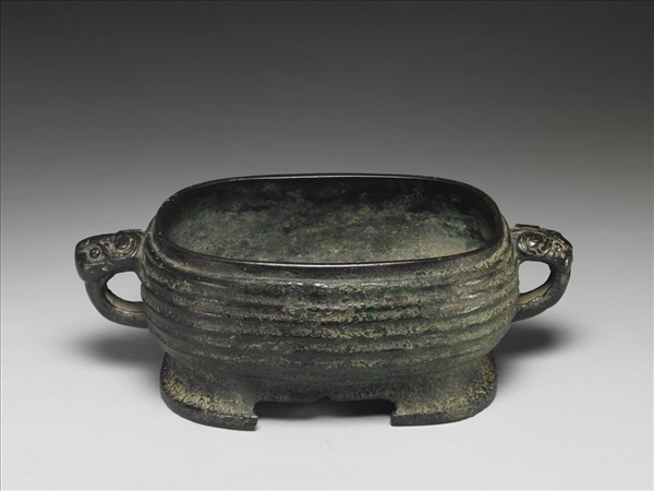 橫截面橢圓,圈足前後正有缺口,兩狹端正中有耳,器外外表有瓦紋,兩耳上段作獸首形。器內底有銘文三行十四字,重文一字:「華季嗌作寶簋,其萬年子子孫永寶用。」