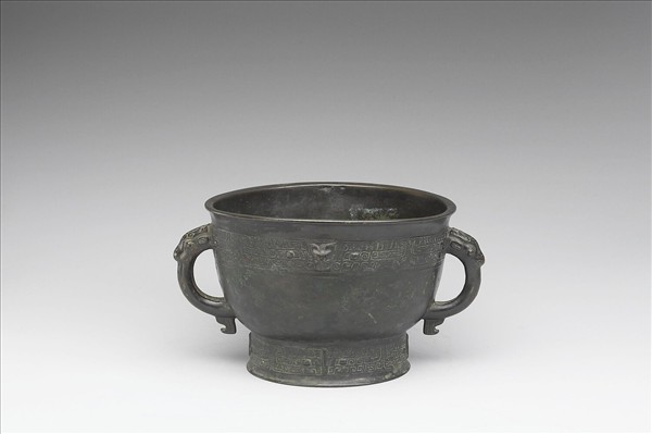 圓口,雙耳,圈足,耳作獸首形附珥。頸飾獸面紋,中央有小獸首,足飾獸面紋。附玉頂木蓋。