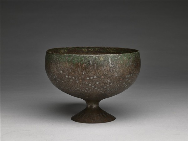 圓口,細短柄,盤形圈足。器腹可見波浪式的連珠紋帶交會,間隔填滿花葉紋,圖塊以銀片鑲嵌。口緣及圈足上各有一周庫發體(Kufic)銘文,是伊斯蘭文化中常用於抄寫可蘭經的古體文。銘文內容為向真主阿拉祈求人世名利的祝願之語。經比對,此器可能來自伊朗東部呼羅珊,年代約為十三世紀。著錄於《西清續鑑‧ 甲編》附錄一,作〈唐時回銅器〉。