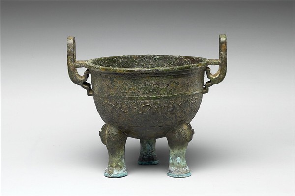 圓鼎,盤口,附耳,獸足。腹飾夔紋、獸面紋,以雷紋為地,足有棱脊。