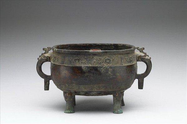 圓簋,盤口,雙耳,圓腹,耳做獸首形,下有附珥,腹下接四獸足。口沿與腹底各有一圈幾何紋飾帶。