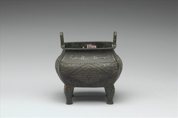 方鼎,盤口,縮頸,立耳,弧形腹,平底,獸足。以雷紋為地,頸飾夔紋,腹以菱格內填雷紋區分紋飾單元,各單元中央為八角紋,外圍為如意雲紋。耳飾幾何紋。