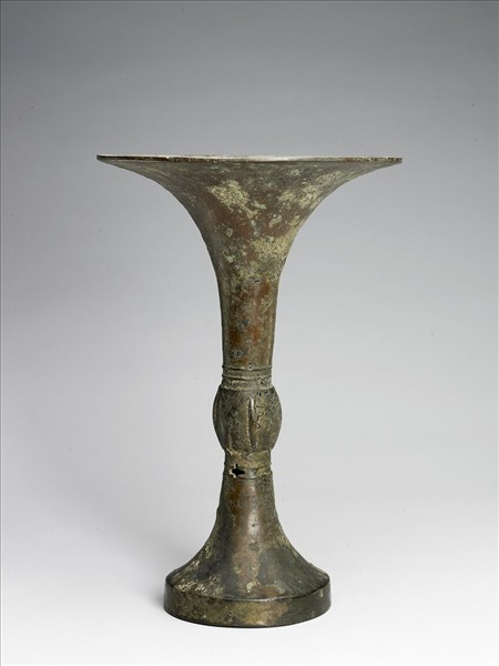 觚,侈口,鼓腹,圈足,腹有棱脊。腹與脰、足交接處皆飾弦紋,腹、足交接處有二個十字形孔。