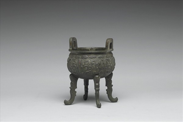 與《西清續鑑》所載「漢饕餮鼎」相似。四足圓鼎的造型罕見於商周古銅器,腹部裝飾雷文地獸面紋,上方一周蟬紋,四足為扁體夔形。表面有紅綠假鏽,底部的銘文為一層假鏽所覆蓋,透過X光,可看到中心為「敬一主人」,周圍為「大明崇禎捌年潞國製成壹器」,可知本件器物為明末襲封於河南衛輝的潞王朱常淓所鑄。關於潞王仿製古銅器在清初王士禎《池北偶談》卷十九曾載﹕「故明潞藩,敬一主人……又嘗仿宣和博古圖式,造銅器數千枚,瘞地中……。」本件潞國銅鼎,當是朱常淓在順治二年降清、三年遇害之後歸入清宮,並於銘文部分以假鏽掩之。敬一主人鑄器散見海內外,目前所見在北京故宮藏有銅鼎二,一為崇禎八年、一為九年(1636);日本藏有一件銅觚,銘文格式相同,為崇禎九年所製。