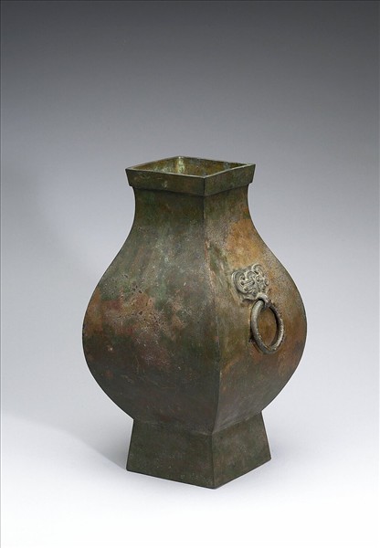 鈁,方口,四壁圓曲,方足,肩作二獸面銜環。