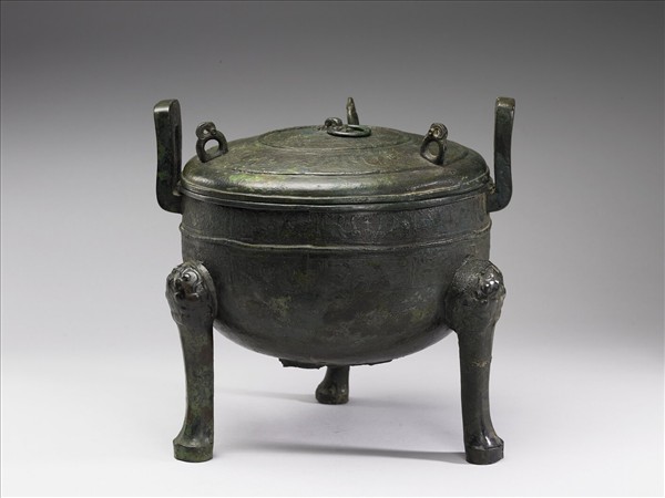 鼎,平頂蓋,蓋上有三環耳,子母口,附耳,圓腹,獸足,一足已殘。蓋面中央有綯紋與交蛇紋,蓋緣與器腹紋帶均飾獸紋,腹中央有凸弦紋一道。
