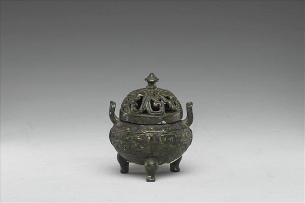 附蓋圓,雙耳,縮頸,三足,蓋有鈕。蓋飾鏤空幾何紋,腹飾夔紋。