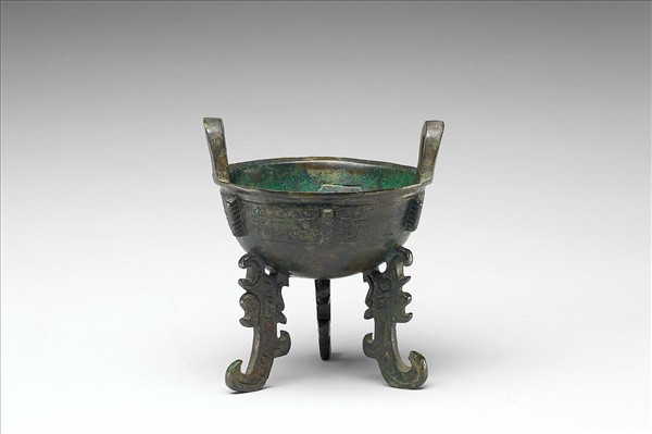 圓鼎,盤口,立耳,扁足,腹有棱脊。腹飾獸面紋,足飾夔紋。器內有銘。