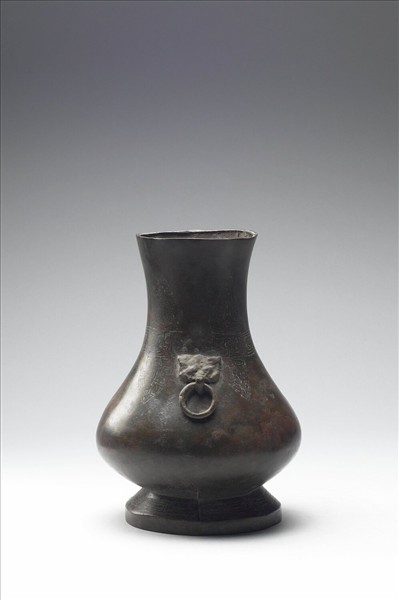 圓壺,直口,長頸,斜肩,鼓腹,階狀圈足,器肩兩側有鋪首銜環。器肩處有陰刻有目竊曲紋帶,往上於頸部、往下於肩部延伸出三角葉紋,圈足處飾有重環紋。附銅膽。