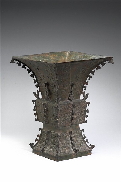 方尊,撇口,方腹,階狀圈足,鉤狀棱脊,肩部有四立雕獸首。脰部為蕉葉紋與獸面紋帶,蕉葉為變形獸面組成,腹部與圈足處紋飾帶則為夔龍紋與獸面紋,以雷紋為地。器內有銘文。